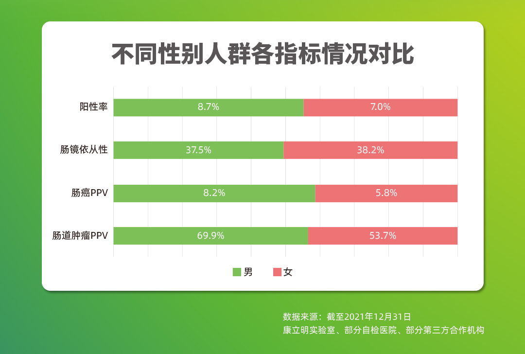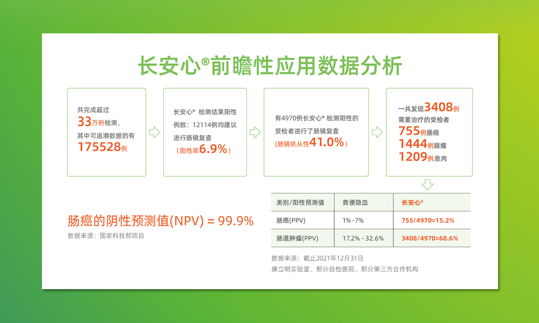 截至2021年12月,作為持續(xù)披露真實(shí)世界應(yīng)用數(shù)據(jù)的腸癌糞便基因檢測(cè)產(chǎn)品,長安心®共完成33萬例前瞻性應(yīng)用檢測(cè),其中175528例應(yīng)用數(shù)據(jù)可追溯,12114例受檢者長安心®檢測(cè)結(jié)果陽性(陽性率6.9%),其中4970例長安心®檢測(cè)結(jié)果陽性的受檢者進(jìn)行了腸鏡復(fù)查(腸鏡依從性41.0%),一共發(fā)現(xiàn)3408例需要治療的受檢者,其中755例腸癌,1444例腺瘤,1209例息肉。長安心®對(duì)腸道腫瘤的預(yù)測(cè)值(PPV)為68.6%(其中腸癌的陽性預(yù)測(cè)值為15.2%),來自國家科技部項(xiàng)目的數(shù)據(jù)顯示,長安心®的陰性預(yù)測(cè)值更是高達(dá)99.9%。