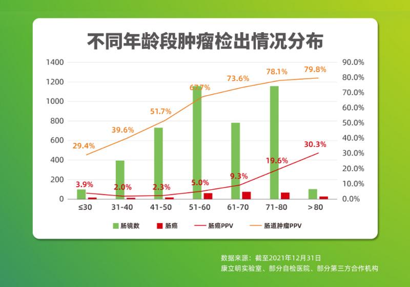 截至2021年12月,長安心®共完成33萬例前瞻性篩查,其中175528例篩查數(shù)據(jù)可追溯,12114例受檢者長安心®檢測結(jié)果陽性(陽性率6.9%),其中4970例長安心®檢測結(jié)果陽性的受檢者進(jìn)行了腸鏡復(fù)查(腸鏡依從性41.0%),一共發(fā)現(xiàn)3408例需要治療的受檢者,其中755例腸癌,1444例腺瘤,1209例息肉。長安心®對(duì)腸道腫瘤的陽性預(yù)測值(PPV)為68.6%(其中腸癌的陽性預(yù)測值為15.2%)。